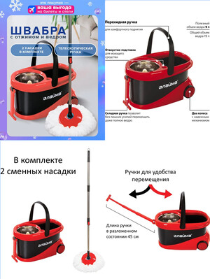 | Заказ привезли быстро. Надежды были не совсем оправданы. Цена набора: 3531 руб В комплект входит: 1.Ведро на колёсиках с барабаном, 2.Самоотжимающаяся швабра, 3.Две насадки, 4.Диспенсер для моющих средств.